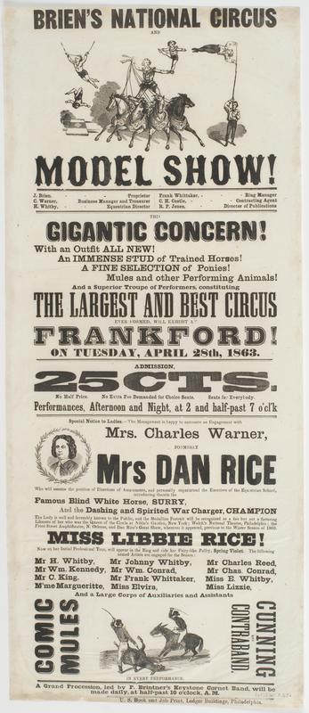 with Mrs. Charles Warner, formerly Mrs Dan Rice ... Miss Libbie Rice! now on her initial professional tour, ... A grand procession,
