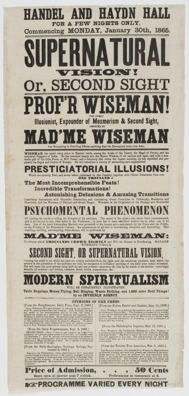 Supernatural vision! or, Second sight : Prof'r Wiseman! the great illusionist, expounder of mesmerism & second sight, assisted by Mad'me Wiseman far surpassing in startling effects anything that the Davenports have ever done. Wiseman has spent many years in Eastern lands, ... He will introduce a variety of astounding and unparalleled prestigiatorial illusions! ... Modern spiritualism will be frequently illustrated. Table rappings, money flying, bell ringing, watch striking, and 1,000 more droll things! by an invisible agency. ... Price of admission, 50 cents Doors open at quarter past 7 o'clock. Performance to commence at 8. Programme varied every night