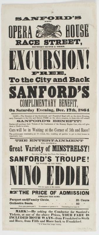 Sanford's new Opera House Race Street, between Second & Third, : Excursion! Free, to the city and back Sanford's complimentary benefit, on Saturday evening, Dec. 17th, 1864 Card.--The directors of the Southwark and Frankford Road will, on the above evening, carry passengers to the city and return free on the above occasion, to those who will attend Sanford's benefit! Parties will purchase their tickets of the conductors of the dummy engine cars, who will give them a check to return. Cars will be in waiting at the corner of 5th and Race! The performance terminating at 10 o'clock, thus enabling all parties to get to their homes in respectable time. The entertainment will comprise a great variety of minstrelsy! New acts, new songs, new pieces, new dances, by Sanford's Troupe! The wonder of the world, Nino Eddie will also appear on this occasion. The price of admission remains the same. Parquet and family circle, 25 cents Orchestra seats, 50 " Doors open quarter-past 6. To commence at quarter of 8. Terminating at or near 10. Mark!----By asking the conductor for Sanford's tickets, at any of the above prices, your fare is included both ways---from Frankford to Sixth and Race, from Fifth and Race back to Frankford.