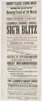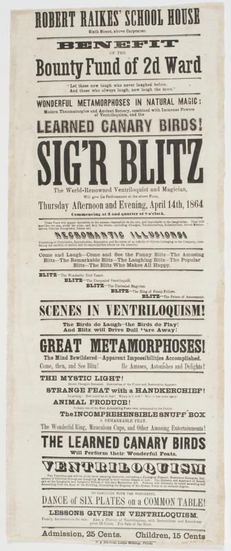 Robert Raikes' School House Sixth Street, above Carpenter. Benefit of the Bounty Fund of the 2d Ward : Wonderful metamorphoses in natural magic: modern thaumaturgics and ancient sorcery, combined with immence powers of ventriloquism, and the learned canary birds! Sig'r Blitz the world-renowned ventriloquist and magician, will give his performances at the above place, Thursday afternoon and evening, April 14th, 1864 commencing at 3 and quarter of 8 o'clock. ... To conclude with the wonderful Dance of six plates on a common table! Lessons given in ventriloquism. Family amusements for sale. Also, A history of ventriloquism, with instructions and anecdotes price 15 cents. For sale at the door. Admission, 25 cents. Children, 15 cents