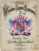 Illustration: color lithograph of the crest of the Yale "Cochlearureati," with an arm holding a wooden spoon above a shield, which has crossed wooden spoons in the upper left quarter and an upside down Phi Beta Kappa key in the lower right. The words "Super Sinistram Lugemus [We feel bad over the left]" written diagonally across the shield in a blue sash. "Honi soit qui mal y pense [Shame upon him who thinks evil of it]" written on either side of shield and "In hoc signo vinces [In this sign you will conquer]" underneath.