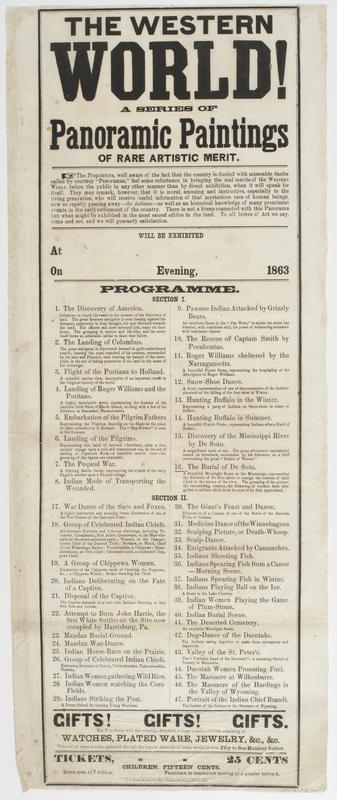 The Western world! A series of panoramic paintings of rare artistic merit. : The proprietors, well aware of the fact that the country is flooded with miserable daubs called by courtesy "panoramas," feel some reluctance in bringing the real merits of the Western world before the public in any other manner than by direct exhibition, ... Will be exhibited at [blank] on [blank] evening, [blank] 1863 ... Gifts! Gifts! Gifts! The proprietors will, this evening, distribute a large number of gifts, consisting of watches, plated ware, jewelry, &c., &c. The cost of these articles, procured through the regular channels of trade, would be from fifty to one hundred dollars. Tickets, 25 cents Children, fifteen cents. Doors open at 7 o'clock, panorama to commence moving at a quarter before 8.
