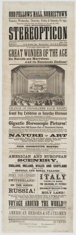 Odd Fellows' Hall, Norristown Tuesday, Wednesday, Thursday, Friday & Saturday ev'ngs, September 29th and 30th, and October 1st, 2d, and 3d, 1863. : The wonderful stereopticon Proprietor John Toy Delineator E.E. Hulfish, Esq. Manipulator Prof. E.B. Merchants It has been pronounced the great wonder of the age Its results are marvelous, and its resources endless! Change of programme each night! Grand day exhibition on Saturday afternoon October 3d, commencing at 3 o'clock. The stereopticon is a new and powerful apparatus, which, with the aid of the strongest artificial light that science has yet created, produces gigantic stereoscopic pictures! covering over 800 square feet of illuminated canvas, ... At each entertainment will be presented a choice selection, comprising the grandest and most attractive views of American and European scenery, ... The whole comprising the most noted objects of interest, as seen by travelers in a voyage around the world!! Each evening will be presented a number of interesting local views, choice specimens of monumental sculpture, &c., and statues and colossal portraits of eminent American heroes & statesmen ... Admission, 25 cents Doors open at 7 o'clock. To commence at 8.