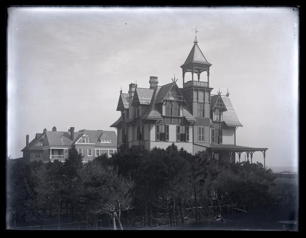 Glass negative showing a view of the Morris family home Avocado, a multi-story house featuring a tower with a balcony, a wide porch, and tracery deocation. A line of trees blocks the view of the lower portion of the house and another building stands to the left. Elliston Perot Morris bought property in Sea Girt, N.J. in 1875, where he built the summer home Avocado after designs by Quaker architect Hibberd Yarnall. Morris left Avocado, named after a Perot family estate in Bermuda, to his daughter Elizabeth Canby Morris in his will. It was sold in 1947 after her death. By 1958 the house had been demolished.