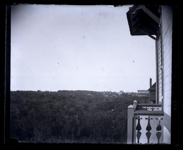 Glass negative showing a view of a forest seen from above. The railing of a balcony of the Morris family home Avocado is visible in the foreground and other houses stand on the right in the background. Elliston Perot Morris bought property in Sea Girt, N.J. in 1875, where he built the summer home Avocado after designs by Quaker architect Hibberd Yarnall. Morris left Avocado, named after a Perot family estate in Bermuda, to his daughter Elizabeth Canby Morris in his will. It was sold in 1947 after her death. By 1958 the house had been demolished.