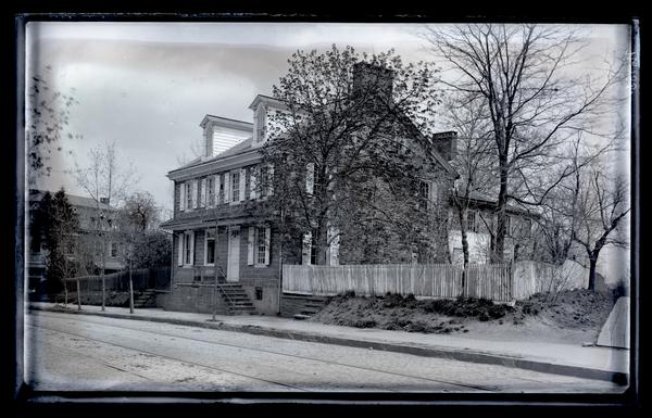 Glass negative showing the two-story stone house at 605-6507 Germantown Avenue owned by Mrs. Billmeyer. The house has shuttered windows and two gabled windows on the roof. A wooden fence extends to the right of the house and stone steps lead from the sidewalk to the front entryway. Trolley tracks run down the center of the brick road runs. Michael Billmeyer's house was built around 1730 by George Bensell. Tradition says that Washington conducted the Battle of Germantown from here. The house was purchased by Michael Billmeyer, German printer for the Pennsylvania Assembly, in 1789. It became part of the Colonial Germantown District during the late 20th century.