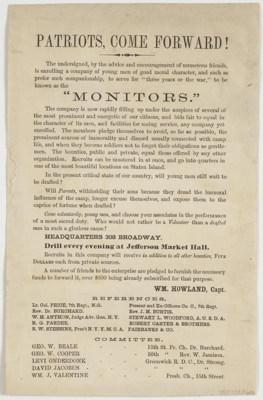 Patriots, come forward! : The undersigned, by the advice and encouragement of numerous friends, is enrolling a company of young men of good moral character, and such as prefer such companionship, to serve for "three years or the war," to be known as the "Monitors." The company is now rapidly filling up under the auspices of several of the most prominent and energetic of our citizens, and bids fair to equal in the character of its men, and facilities for seeing service, any company yet enrolled. The members pledge themselves to avoid, so far as possible, the prominent sources of immorality and discord unsually connected with camp life, and when they become soldiers not to forget their obligations as gentlemen. The bounties, public and private, equal those offered by any other organization. Recruits mustered in at once, and go into quarters in one of the most beautiful locations on Staten Island. ... Headquarters 308 Broadway. ... / Wm. Howland, Capt. ...