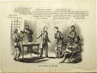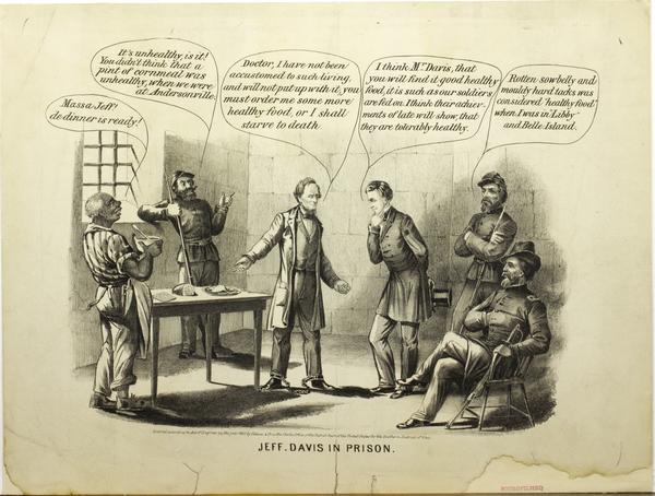 Anti-Davis cartoon invoking the travesties at Confederate war prisons to satirize the incarcerated former Confederate president as a pompous, sniveling ingrate. Shows Davis, attired in a suit, and his feet shackled, in his cell, in front of a table containing his modest meal and complaining to the prison doctor. He bemoans his being unaccustomed to such living and that "you must order some more healthy food, or I shall starve to death." The doctor responds it is "good healthy food, such as our soldiers are fed on" and that their recent achievements prove it is "tolerably healthy." In the left, an older African American man cook, portrayed in racist caricature, announces in the vernacular "Massa Jeff! de dinner is ready." Two Union soldiers retort and reply "It's unhealthy is it! You didn't think that a pint of cornmeal was unhealthy when we were at Andersonville." The other angrily remembers "Rotten sowbelly and mouldy hard tacks was considered 'healthy food' when I was in "Libby" and Belle Island.