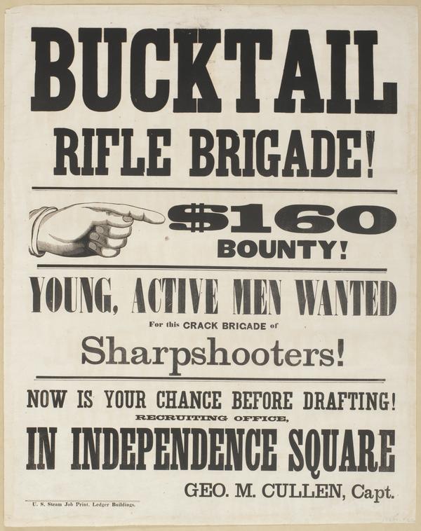 Bucktail Rifle Brigade! : $160 bounty! Young, active men wanted for this crack brigade of sharpshooters! Now is your chance before drafting! Recruiting office, in Independence Square / Geo. M. Cullen, Capt.