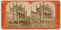 View looking southeast at the west elevation of the Main Exhibition Building designed by Henry Pettit and Joseph M. Wilson. The fair celebrated the centennial of the United States through an international exhibition of industry, agriculture, and art.