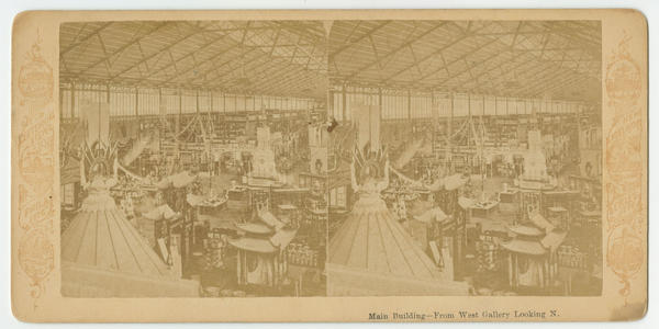 Elevated, interior view looking north at displays in the Main Exhibition Building designed by Henry Pettit and Joseph M. Wilson. Includes the dome of the "Republica de Chile" exhibit and signs for "Victoria" and "South Australia". The fair celebrated the centennial of the United States through an international exhibition of industry, agriculture, and art.