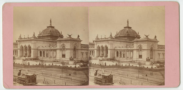Oblique, exterior view of south elevation of hall built 1874-1876 after designs by Hermann J. Schwarzmann. A locomotive travels west on railroad tracks in the foreground. The fair celebrated the centennial of the United States through an international exhibition of industry, agriculture, and art.