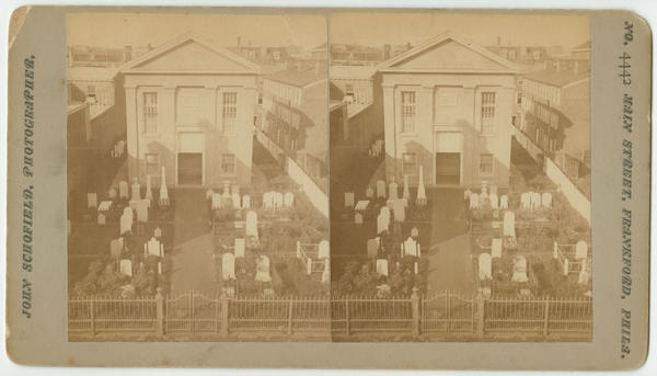 above Girard Avenue to replace the frame structure built on the same site in 1817. Also shows the tombstones in the small