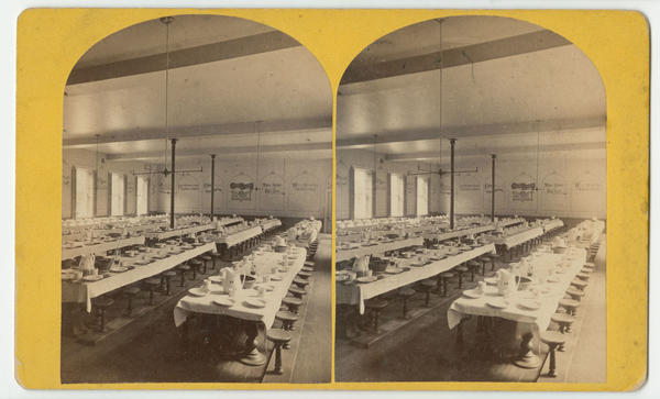 hallway of the "B" division, the kitchen, and the dining room with long rows of tables covered with place settings in preparation