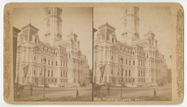 Oblique view of the north side of City Hall built 1871-1901 after designs by John McArthur, Jr., including the lower portion of the tower. Begun in 1884, the tower was in the final stages of construction at the time of this photograph. Also shows a crane and construction materials on the sidewalk in front of the City Hall and a horse-drawn coach and pedestrians traveling around Penn Square in the foreground.