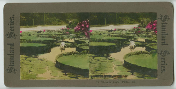 View of water lilies and lily pads in the lily pond near Horticultural Hall in West Fairmount Park. Building, pond and gardens constructed for the Centennial celebration in 1876.