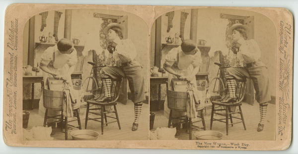 Genre scene satirizing the "new woman" and the role reversal of men and women in the home. Depicts a woman attired in bloomers and gloves (bicycle garb), with one foot propped on a chair as she smokes. Her husband bends over the wash tub and wrings an article of clothing as he does her laundry, some of which dries above their heads on a line. The woman's bicycle is propped near the door.