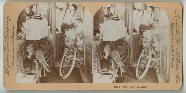 Genre scene satirizing the "new woman" and the role of women in the home. Shows the lady of the house sitting at a table reading a newspaper as her husband stands in the kitchen dryng dishes. With a confused look, he peers at her from the other room. She is dressed in bicycle garb with her bicycle resting in the doorway nearby.