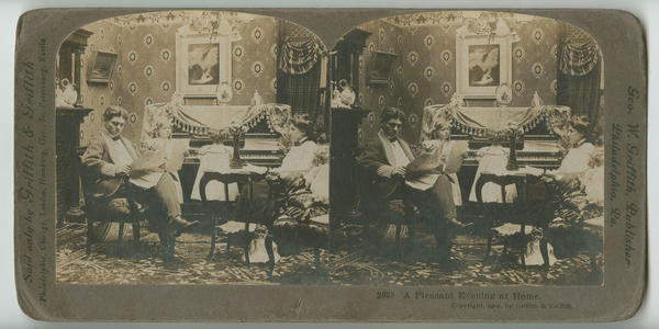 Genre photograph showing an interior view of a family recreating in their den or living room. Shows a mother watching her two daughters as one plays the piano and the other holds sheet music. Their father reads the newspaper nearby.