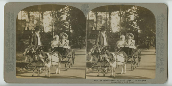 View showing two young girls seated in a carriage pulled by two goats at the Philadelphia Zoo. A smiling man stands next to them. Another man standing on an elevated pavilion or gazebo is visible in the background.