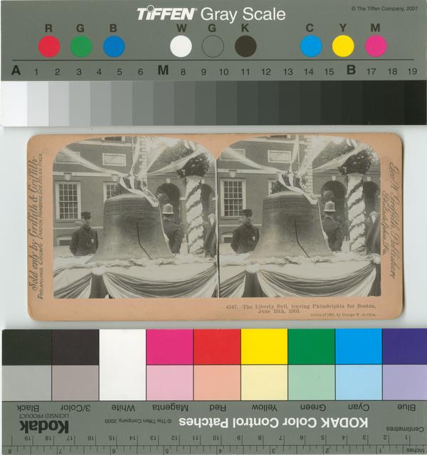 View showing the Liberty Bell on a float adorned in patriotic bunting in front of Independence Hall on Chestnut Street. Two military escorts stand nearby. The Liberty Bell traveled to Boston in 1903 for the 128th anniversary of the Battle of Bunker Hill.