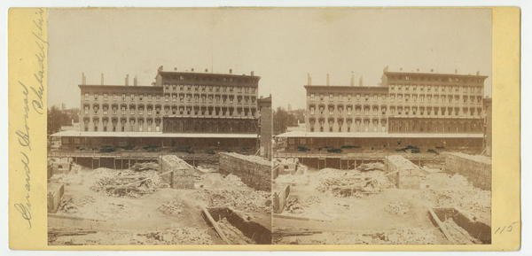 View showing the Girard House hotel, built from 1851-1852 after the designs of John McArthur, Jr., at 823-835 Chestnut Street. Signage advertising John O. Mead & Sons, silverplaters, adorns the hotel building. In the foreground, construction work on the foundations of the Continental Hotel (built 1857-1860), also after the designs of McArthur, is visible.