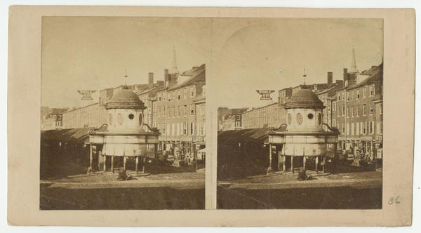 View showing the "New Jersey" Market terminus at the corner of Market and Front streets. The terminus, designed with cupola and clock and adorned with horns of plenty, was built in 1822 and operated until the abolition of street markets in 1859. In the background, businesses line the north side of the 100 block of Market Street, including: Thomas J. Mecauley, tin hardware (105 Market); R & W.C. Biddle & Co., hardware, (131 Market); and the seed and agricultural warehouses of Philip B. Mingle & Co. (103 Market) and Rogers & Boyer (111 Market). Also includes a partial view of William D. Jones & Co., dry goods, (217 Market) in the distance.