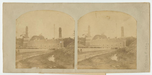 View showing the rear of the engine house at the Schuylkill Water Works (formerly the Spring Garden and Northern Liberties Water Works) at the foot of Thompson Street on the Schuylkill River. Also shows the stand-pipe erected circa 1854 in the background and men leaning on the fencing surrounding the water basin in the foreground. The waterworks, completed circa 1845 after the designs of engineer William E. Morris, provided water to the Spring Garden, Northern Liberties, and Kensington neighborhoods.