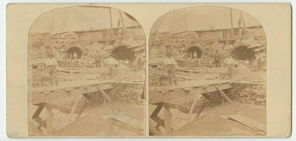 View showing the construction site on the mound dam of the new mill house at the Fairmount Water Works on the Schuylkill River. The new mill house, built between 1859-1862 after the designs of Philadelphia engineer Henry P.M. Birkinbine, housed the turbine engines that replaced the water wheels, which previously powered the waterworks. Shows several construction workers posed near the flumes, with wheelbarrows, on scaffolding, and on a raised walkway across a channel of water. Also shows a man with a top hat , possibly Birkinbine, standing in the center of the site.