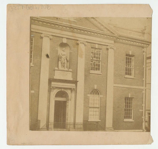 1789-1790 after the designs of Dr. William Thornton at Fifth and Library streets. View includes the Benjamin Franklin statue