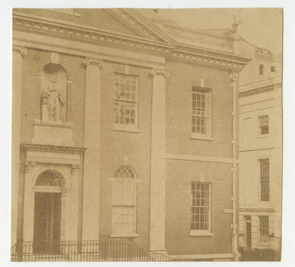 1789-1790 after the designs of Dr. William Thornton at Fifth and Library streets. View includes the Benjamin Franklin statue