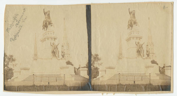 Shows the monument sculpted by Thomas Crawford and Randolph Rogers installed at Capitol Square in 1850. Sculpture includes figure of Washington on horseback and six smaller figures of important Virginians including Patrick Henry and Thomas Jefferson. View includes church steeples in the background.