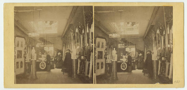 Interior view of the first floor of Earle's shop. Walls are lined with elaborately framed mirrors and works of art, and several statues. Includes staff and customers, and the stairway to the upper gallery. British-born James S. Earle (nephew of glazier and gallery owner James Earle) established his looking glass, frame making, and picture dealing business in 1832 on the 100 block of South Fifth Street. Earle relocated to the 800 block of Chestnut Street by 1840 and the business was renamed James S. Earle & Son by 1858 and James S. Earle & Sons by 1860.