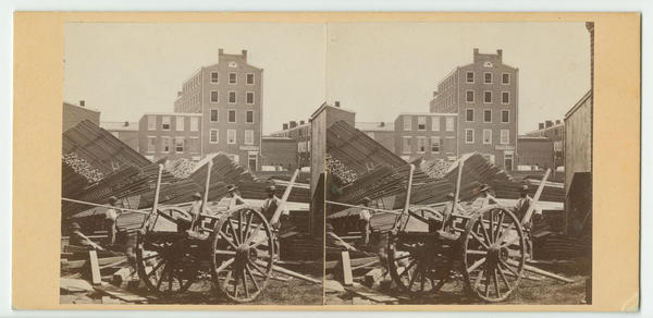 View showing the wrecked lumber yard of Jacob and George A. Binder, lumber dealers, at the southeast corner of 6th and Oxford streets. Workers stand in front of lopsided piles of lumber near a dray. Unscathed buildings are visible in the background, including the business of Schoening & Harm, morroco manufacturers at 1528 North 5th Street.
