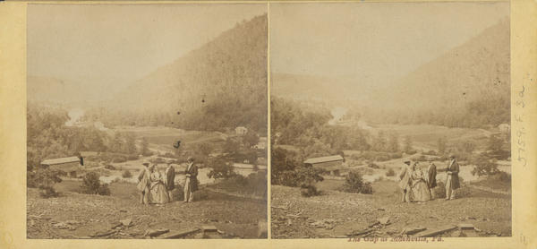 Shows a group of elegantly dressed men and a woman standing on a ridge above a valley near the Catawissa Creek and Catawissa Mountain. Also shows a covered bridge and a homestead.