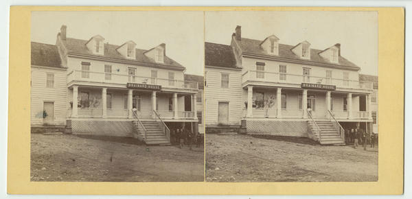 Exterior view of the two-story hotel with a veranda, possibly in Philadelphia. Includes a group of men and children standing near the front steps.