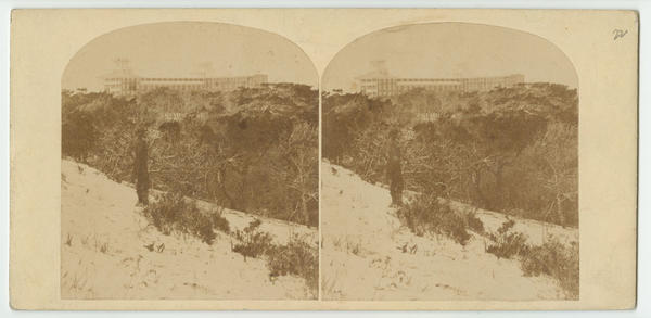 Depicts a man on the beach looking past a grove of trees toward the palatial hotel situated on the block bounded by Atlantic, Delaware, States, and Pacific avenues. The luxury hotel, one of the city's first, opened in 1854 under the ownership of the Camden and Atlantic Railroad. The hotel was razed in 1898.