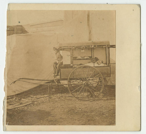 Series of views showing the two-wheeled Finley ambulance wagon displayed in front of a draped pile of lumber; while attended