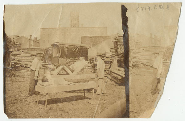 Series of views showing the two-wheeled Finley ambulance wagon displayed in front of a draped pile of lumber; while attended