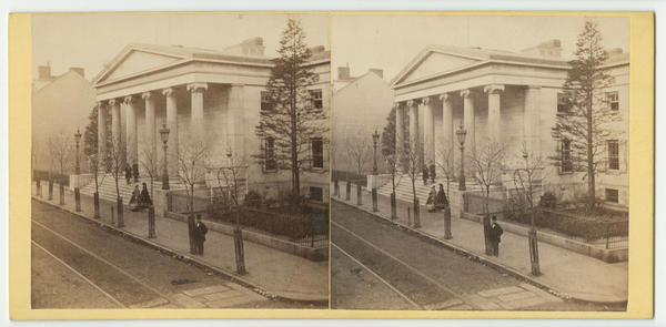 Exterior view of the second mint building at 1331-1337 Chestnut Street (northwest corner of Juniper and 13th streets) completed in 1833 after the designs of William Strickland and possibly John Haviland. The mint operated at the site until 1902 when the agency relocated and the building was razed. Pedestrians stand on the steps of, in front of, and near the building. Trees protected by iron cages line the street in the foreground.
