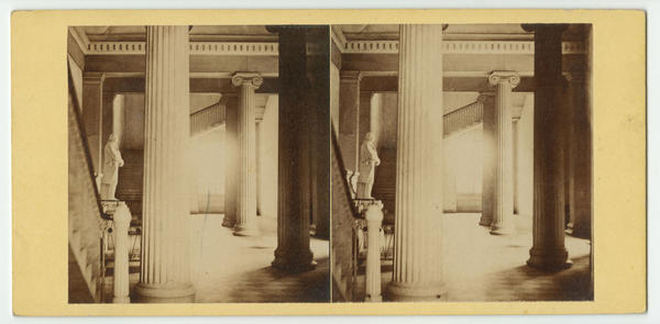 View showing the front foyer of Founder's Hall, constructed 1833-1847 in the Greek Revival style after the designs of Philadelphia architect Thomas Ustick Walter, at 1201-1211 West College Avenue. View includes the statue installed in front of the sarcophagus holding Girard's remains located in the foyer. Girard College was established through a bequest from Stephen Girard, a Philadelphia financier and philanthropist, for the creation of a school for "poor white orphans."