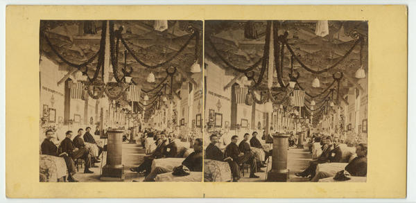 Shows a heavily decorated patient ward at the Civil War hospital established in February 1863 at Germantown Avenue and Cayuga Street in Nicetown. Two rows of recovering soldiers seated next to their beds line both sides of the ward. Decorations include streamers, flags, lace bedspreads, flowers, framed pictures, and patriotic statements of affirmation painted on the walls. Also shows a row of heaters down the middle of the floor.
