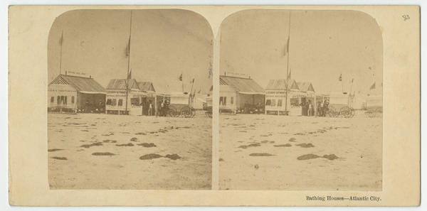Shows bathhouses operated by Leedom & Finney National Bath House lining the beach. Also shows patrons at a nearby oyster stand and clothes hanging on lines beside the bathhouses.
