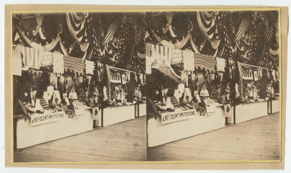 Depicts handicrafts and other goods for sale at a table with a "Benevolent Institutions" signboard. Patriotic bunting hangs