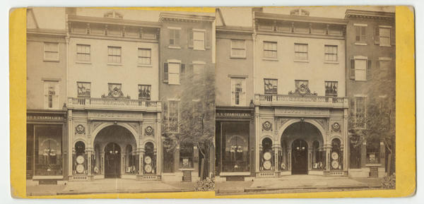 Exterior view of photographic studio of Washington Lafayette Germon including window displays containing large photographic portraits. Germon was located at this address from 1865 to 1872.