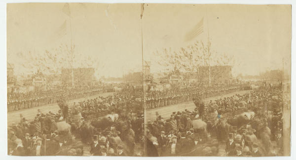 View showing throngs of mourners at Abraham Lincoln's funeral procession. Mourners crowd the sidewalks as well as the rooftops