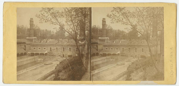 View showing the rear of the engine house at the Schuylkill Water Works (formerly the Spring Garden and Northern Liberties Water Works) at the foot of Thompson Street on the Schuylkill River. Also shows a rowboat near the fenced water basin of the waterworks in the foreground. The waterworks, completed circa 1845 after the designs of engineer William E. Morris, provided water to the Spring Garden, Northern Liberties, and Kensington neighborhoods.