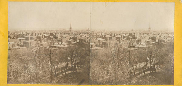 Panoramic view showing several city blocks southeast from the State House at 520 Chestnut Street. Includes the 500 block of Walnut Street; Independence Square; the steeple of St. Peter's Church (300-340 Pine), and a distant view of Spark's shot tower near the Delaware River.