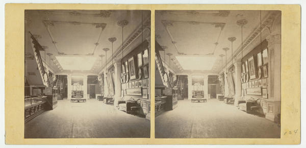 Depicts the elegantly decorated interior of the photographic studio operated at 914 Chestnut Street from circa 1865 to circa 1871. The large waiting room is adorned with sofas, chairs, framed photos, framed artwork, and a skylight. Also includes stairwells decorated with signage; a piano advertisement; and a counter adorned with the photographic studio's pricesheet (effective January 1865). William H. Dutton sold pianos at 914 Chestnut Street in 1869.