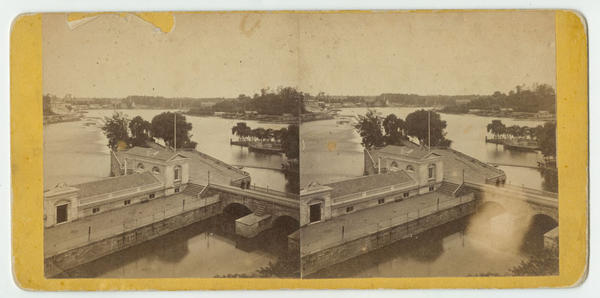 View from above the waterworks looking northwest across the Schuylkill River including a partial view of the old and new mill houses; the mill race; the dam and several boathouses.